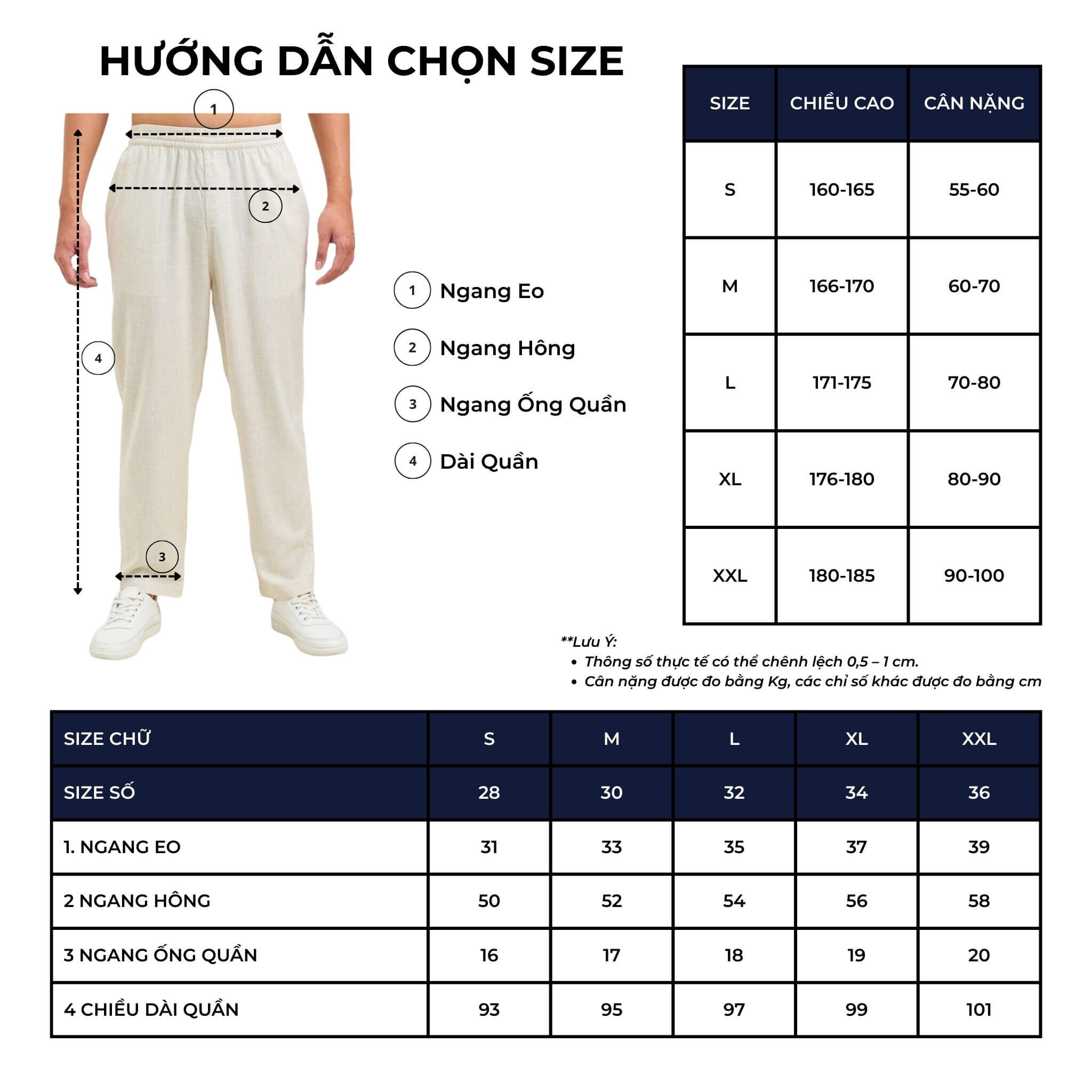 Bảng size mang tính tham khảo, có thể chênh lệch 2–3cm tùy theo chất liệu và form dáng.